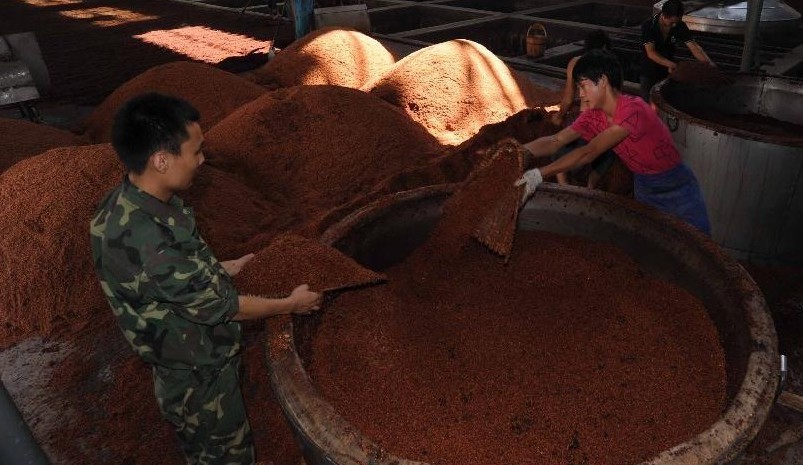 制曲時間在夏天,制曲車間里的溫度經(jīng)常高達40攝氏度。高溫有利于微生物的生長,這些微生物混入曲塊中分泌出大量的酶,可以加速淀粉、蛋白質(zhì)等轉(zhuǎn)化為糖分。